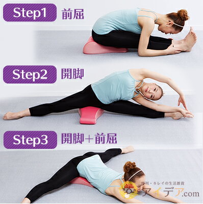 股関節周りを柔軟に 「開脚クッション」は、傾斜が付いているので、座るだけで骨盤の前傾が補助されて背筋がぴんとして、膝がまっすぐと伸びやすくなります。